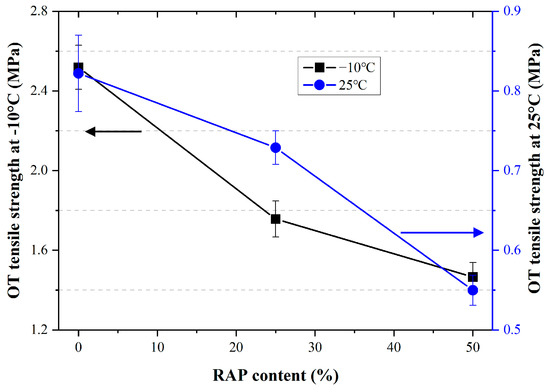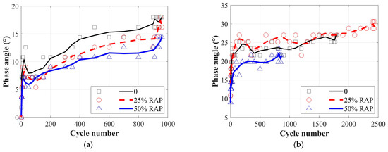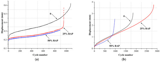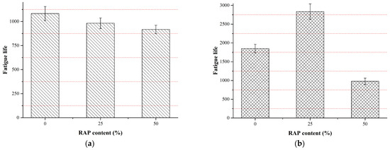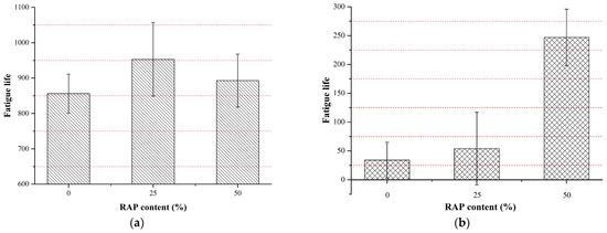 - Two methods were adopted to determine the fatigue life of HMA with different contents of RAP: the cycle number when the specimen fractured in the OT fatigue test; and the cycle number determined by the 50% modulus reduction method. RAP was proved to be beneficial in prolonging fatigue life using the two methods at 25 °C. However, opposite conclusions were made about the effect of RAP on fatigue life at −10 °C.