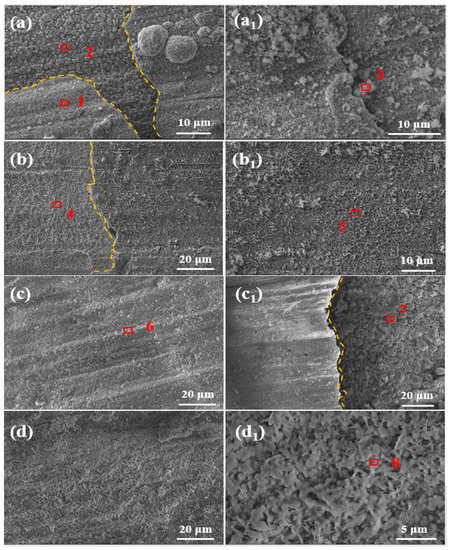 3.5. Analysis of Cross-Section Morphology of Corrosion Products