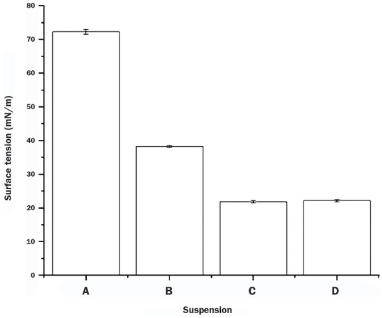 Surface tension values attributed to different suspensions, A, B, C, and D.
