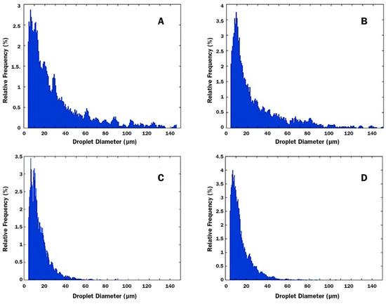 Droplet size distributions attributed to the atomization of different suspensions (A–D).