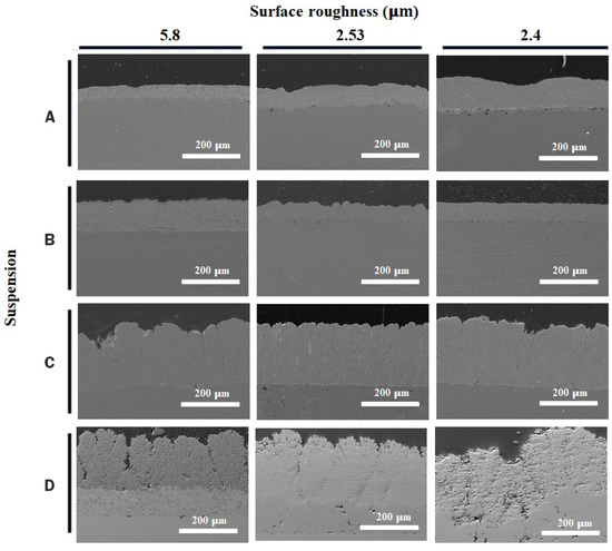 Cross-sectional SEM micrographs of the coatings that were deposited from A, B, C, and D suspensions on substrates with different surface roughness values: 2.4, 2.53, and 5.8 µm. In all cases, the spray distance was set to 75 mm.
