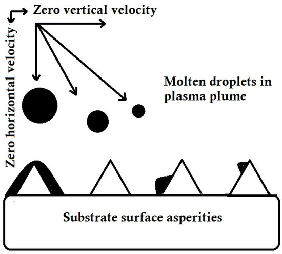 Finally, after the droplets impact the substrate, they form splats or flattened droplets that adhere to the surface. The surface tension of the suspension can influence the spreading behavior of the droplets during splat formation. Higher surface tension can cause the droplets to spread less, resulting in smaller splats with a higher aspect ratio [15,16,17].