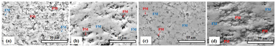 The high-magnification cross-sectional SEM images of SPS coatings, deposited at a 75 mm spray distance from suspensions with different solvents, are presented in Figure 6. All the coatings possess a two-zone (also called bi-modal) type of microstructure, which is common in SPS coatings [20,21,22,23,24]. This two-zone microstructure is made of partially melted (marked PM in Figure 6) zones surrounded by a fully melted (marked FM in Figure 6) dense matrix. The reason for this microstructure formation is that a relatively large portion of the plasma power is consumed to evaporate the liquid solvent in SPS. Thus, some particles or agglomerates become just partially melted and then embedded into the fully melted solid [25]. As seen in Figure 6, increasing the water content in the suspension leads to an increase in the partially melted (PM) zones and porosity in the coating microstructure (Table 3). This is due to the higher evaporation enthalpy of water (2.4 × 106 J/kg) compared to that of ethanol (0.6 × 106 J/kg) [4,5], which consumes more energy and gives rise to incomplete melting of the particles. Moreover, less solid melting contributes to coatings with a higher porosity amount and therefore lower thermal conductivity. The higher surface tension of water, which results in larger atomized droplet sizes, can also make the heat transfer more difficult and favor the increased PM zones in the coating microstructure [26].