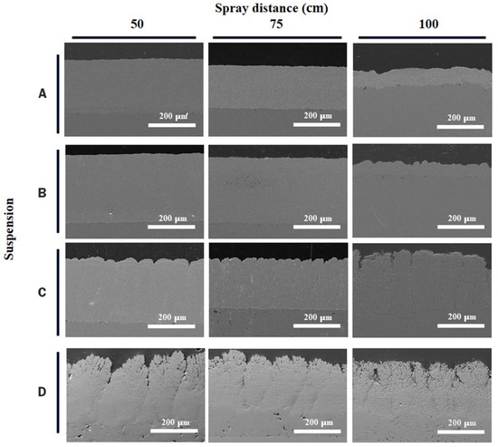 Cross-sectional SEM micrographs from the coatings that were deposited from A, B, C, and D suspensions at different spray distances: 50, 75, and 100 mm. In all cases, the substrate surface roughness value was set to Rq = 2.53 µm.