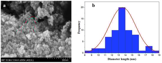 The combination of the materials was clearly depicted in the figure, and the agglomeration was evident, similar to a prior study, which might be avoided by employing an ultrasonic probe. The size distribution (as shown in Figure 1b) and average size of IONPs were calculated from the FE-SEM picture, ImageJ software, and Origin software, and were found to be 13.6 ± 1.9 nm, which is consistent with earlier publications [64,65,66].