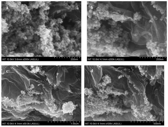 FE-SEM images of IONPs/PVA/CS/GO 1:1:2 at (a) 200 nm, (b) 200 mm, (c) 1 µm, (d) 500 mm.