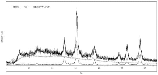 Overlay X-ray diffractogram of SPION, GO, and SPION/PVA/CS/GO.