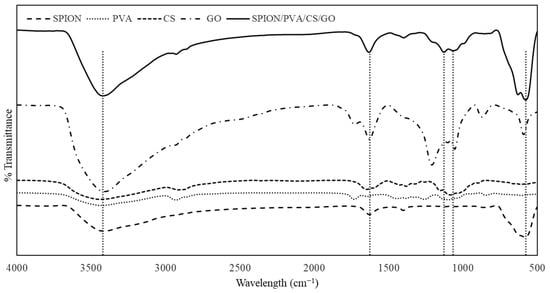 FTIR spectra of SPION, PVA, CS, GO, and SPION/PVA/CS/GO.