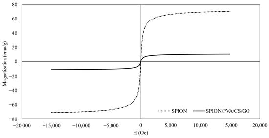 When a sample vibrates perpendicular to a uniform magnetizing field, VSM is a versatile approach for determining the magnetic moment of the sample [90,91]. VSM was used to measure the magnetic characteristics of SPIONs and SPION/PVA/CS/GO at room temperature. All magnetization curves, as can be observed, have s-shaped shapes across the applied magnetic field and no remanence or coercivity, indicating that they all exhibit superparamagnetic activity [92]. The saturation magnetization (Ms) of SPIONs was 70.83, which is consistent with earlier studies [74,93,94]. When PVA/CS/GO were added, the Ms fell from 70.83 to 10.94. These findings indicate that polymer coatings could lower the Ms of nanoparticles. This may be because a thicker layer of polymer is produced on the surface of the magnetic nanoparticles [95]. Hence, the proposed structure of SPION/PVA/CS/GO was shown in Figure 6.