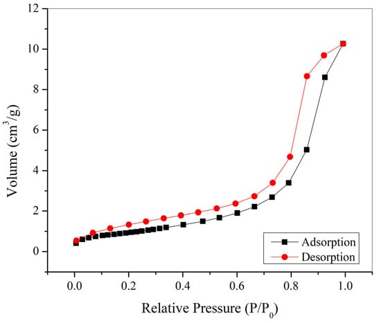 According to Figure 7, the adsorption–desorption isotherm demonstrates that the volume of adsorbate uptake begins at 0.1 p/p0 and increases at higher p/p0.
