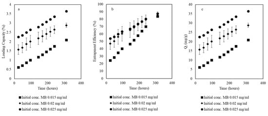 As shown in Table 5, the values of loading amount (Qt), percent loading capacity (%LC), and entrapment efficiency (%EE) for the adsorption process were calculated throughout each hour’s interval based on the results from UV-Vis spectrometry at the wavelength of 664 nm of MB and using the preceding calculation formulas.