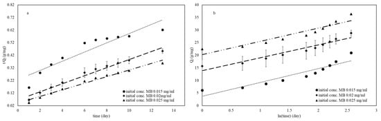 For the nonlinear pseudo-first order model, the values can be obtained by plotting vs. t (in days) with nonlinear regression. On the other hand, the second-order model, by plotting vs. t, and can be calculated by and slope, respectively. Therefore, in this study, the model of pseudo-second order will be analyzed by linear and nonlinear regression; the model or pseudo-first order will be analyzed by nonlinear regression due to the long span of adsorption.