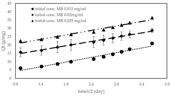 The Higuchi model gives information about the release of the MB from the insoluble matrices (planar system). The model is clarified by the function of the square root of time. The model especially fits with the use of polymers that do not swell when interacting with water.