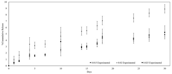 The “Power law” or Korsmeyer–Peppas model describes the release of the adsorbate from polymetric matrices, which is developed from the Higuchi model. The study of MB release is easier with the Korsmeyer–Peppas model when the release mechanism is not well-known or there are several release phenomena included [60].