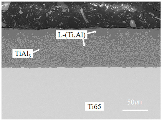 We found that the TiAl3 phase layer can be formed by hot-dip aluminizing at 760 °C for 5–20 min, but its thickness is different. When the hot-dip aluminizing time is less than 10 min, the thickness of the TiAl3 phase layer is low, which is not conducive to the formation of an appropriate thickness Ti–Al alloy phase layer in the subsequent carburizing process, while the hot-dip aluminizing time is too long, which is not suitable for industrial production and is more likely to lead to the generation and expansion of micro-cracks in the TiAl3 phase layer. Therefore, we chose to analyze the structure and properties of the coating obtained by hot-dip aluminizing for 10 min. Figure 1 shows the microstructure of Ti65 after 10 min of hot-dip aluminizing.