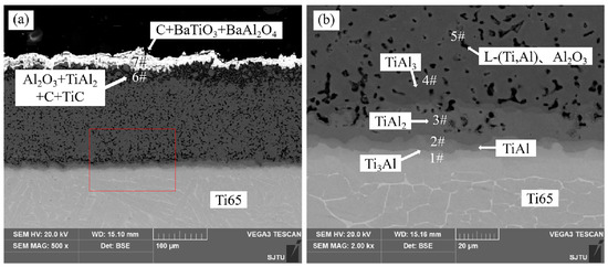 With the increase in thermal exposure time, oxygen continues to diffuse inward. The oxygen reacts with the residual carbon in the depression of the coating surface to produce CO2 and then reacts with the osmotic agent products BaAl2O4 and BaTiO3. The Ti atom in the Ti–Al carburizing layer diffuses outwards and is oxidized by oxygen into TiO2. TiO2 and the oxidation products of BaAl2O4 and BaTiO3 form the mixture BaAlTi5O14. The reaction equation of this interface may be
