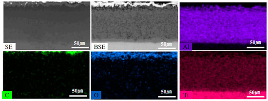 Figure 4 shows that C and O elements are mainly distributed in the carburized layer. EDS results and XRD patterns of the carburized layer indicate that the region is composed of Al2O3, TiAl2, TiC, and free C. In Figure 2a, the white part at the top of the coating is BaAl2O4, BaTiO3, and free C. The BaAl2O4 phase and BaTiO3 phase are generated by the reaction of the energizer BaCO3 with Al and Ti atoms in the process of carburizing, while the free C is formed by the carbon in the carburizing agent remaining in the sag on the surface of the sample.