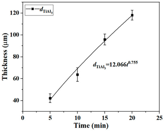 The thickness of the TiAl3 phase is represented by dTiAl, and the growth kinetics curve of the TiAl3 phase was fitted by Equation (1), as shown in Figure 5: