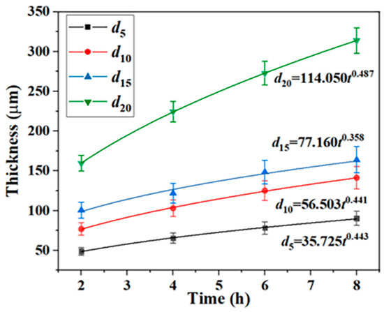 d5, d10, d15, and d20 are used to represent the thickness of the Ti–Al alloy phase layer in the process of carburizing after 5 min, 10 min, 15 min, and 20 min of hot-dip aluminizing, respectively. The growth kinetics curve of the Ti–Al alloy phase layer was fitted by Formula (1), as shown in Figure 6: