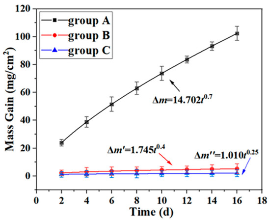 where Δm′ is the oxidation weight gain (mg/cm2) of group B samples and t is the oxidation time (days).