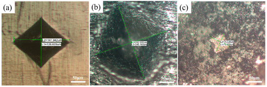 The indentation patterns of (a) the uncoated Ti65 sample, (b) the hot-dip-aluminized (760 °C × 10 min) Ti65 sample, (c) the hot-dip-aluminized (760 °C × 10 min) and carburized (1050 °C × 4 h) Ti65 sample.