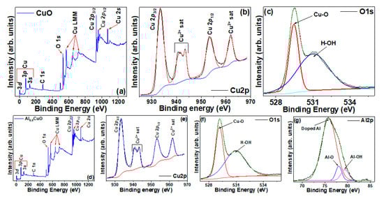 Among the above-mentioned strategies, doping has been found to be an effective route to enhance the physico-chemical and opto-electrical properties by tuning the electronic band structure. Although several atoms have been used to tune the properties of CuO, Al has been observed to be a highly suitable dopant due to its low cost, easy availability, and non-toxicity, as well as its remarkable influence on the structural, morphological, thermal, and optical properties of CuO nanostructures due to the energetically favorable ionic radius of Al+3 (0.53 Å) against Cu+2 (0.73 Å) for substitutional doping [,,].