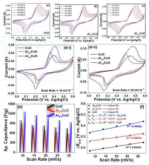 The supercapacitive performance of the undoped and Al-doped samples was examined via CV measurements in a three-electrode system (half-cell). Figure 5a–c shows the CV curves of CuO, Al2.5CuO, and Al5.0CuO electrodes, respectively, at different scan rates. Strong pairs of anodic and cathodic peaks were observed in an aqueous alkaline medium (KOH) within 0.0 to 0.6 V (vs. Ag/AgCl), which can be attributed to the quasi-reversible electron transfer for Cu(I)/Cu(II) transitions, as proposed by the following complex Faradaic redox reactions [,]: