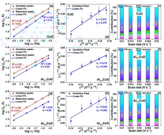where ip (A) is the peak current, ν (V/s) is the scan rate, and a and b are variable parameters (b normally ranges from 0.5 to 1, b = 0.5 denotes the dominant diffusion-controlled process while b = 1 denotes dominant surface-controlled mechanism, and a b-value between 0.5 and 1 suggests a combination of diffusion and capacitive control processes []). Figure 6a,d,g represents the log(ip) vs. log(ν) for CuO, Al2.5CuO, and Al5.0CuO electrodes, respectively, which showed a linear variation with b-values (for reduction/oxidation peaks) around 0.73/0.62 (for CuO), 0.60/0.54 (for Al2.5CuO), and 0.56/0.61 (for Al5.0CuO), respectively, indicating that both surface-controlled (capacitive-type) and diffusion-controlled (battery-type) processes were present in the charge storage mechanism. Additionally, the relative contributions of the above two processes on the overall charge storage performance are examined via Cottrell’s equation []: