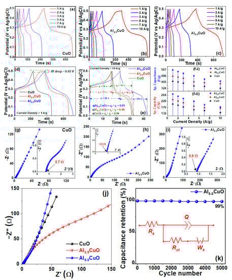 The GCD measurements of all three electrodes at different current densities are presented in Figure 7a–c at a potential window of 0–0.5 V (vs. Ag/AgCl), which was less than that used for the CV measurements (0–0.6 V). The probable occurrence of oxygen evolution reaction at the higher current densities could affect the actual GCD results, as a result of which a smaller potential window (against CV measurements) was chosen for the GCD measurements so that it could reach the boundary at a lower current density. Similar observations were reported in several other publications too [,,,]. The near symmetric charge−discharge profiles along with voltage plateaus at different current densities were in agreement with the CV curves, suggesting excellent rate characteristics with both pseudocapacitive and battery-type behaviors. Figure 7d,e compares the GCD curves of the three electrodes at lower (1 A/g) and higher (10 A/g) current densities, respectively. The 1 A/g GCD profiles revealed higher non-linearity at the peak of the charging curves against the 10 A/g GCD profiles, which was due to the higher surface pseudocapacitance of the electrodes at a lower current density, while the diffusion of ions at the inner regions were activated at higher current densities, leading to quasi-triangular shapes of the curves near the charging−discharging peaks @10 A/g profiles. In addition, the coulombic efficiencies (; where τd/τc = discharging/charging times) of the electrodes were found to be very high (~91%–94%, cf. Figure 7e), indicating an excellent reversibility. In particular, the Al5.0CuO electrode showed a higher discharge profile, indicating better electrochemical performance over other electrodes due to the presence of both surface-controlled (surface pseudocapacitance) and diffusion-controlled (battery-type) processes, as described in Scheme 2. In addition, the IR drop for all of the electrodes was observed to be as low as 0.03 V (cf. Figure 7d), indicating very low interfacial resistances at the electrolyte/active-material and active-material/current collector interfaces [,,,].