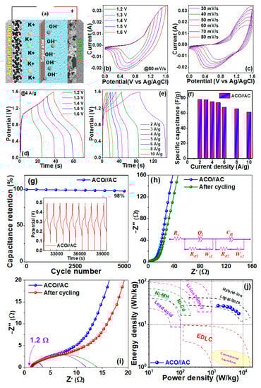 Regarding the practical charge storage applications, the best performing supercapacitor cell (two-electrode device) was fabricated with Al5.0CuO (ACO) as the positive electrode and activated carbon (AC) as the negative electrode (ACO//AC), and the schematic structure is shown in Figure 8a. To determine the optimum operating voltage of the device, CV measurements of the device were performed at different working voltages ranging from 1.2 V to 1.6 V (cf. Figure 8b), and no distortion of the curves was observed, indicating the absence of hydrogen and oxygen evolution reactions at the positive and negative electrodes, respectively, thus verifying that the maximum working voltage window could be extended up to 1.6 V. Therefore, CV characterizations of the device were performed at different scan rates over a 1.6 V working voltage window, and presented in Figure 8c. The near-rectangular shapes of the CV curves, with identical shapes at different scan rates, indicated the combinatorial effects of the Faradaic redox behavior (from ACO electrode) and double-layer capacitance (from AC electrode) with an excellent rate capability and reversibility. Similarly, the GCD measurements of the device were also performed over various working voltages and, maintaining parity with the CV results, undistorted curves were also obtained up to an optimum voltage window of 1.6 V (cf. Figure 8d). Hence, the GCD analysis of the device was obtained at various current densities at a working voltage difference of 1.6 V (cf. Figure 8e). The non-linear, quasi-symmetric shapes of the curves with relatively longer charging−discharging times depicted a very high charge storage capacity and excellent reversibility. In addition, the specific capacitance, calculated from the GCD data, is presented as a function of current density in Figure 8f, which depicts a maximum value around 80 F/g (@2 A/g), and slightly decreased to 62 F/g (@10 A/g), indicating a very good rate capability. The cycling stability and capacitance retention of the device was observed to be very high as it retained 98% capacitance after 5000 GCD cycles (cf. Figure 8g), and the last 10 GCD cycles (shown in the inset of Figure 8g) revealed highly symmetrical GCD curves without any distortion, indicating excellent stability of the device.