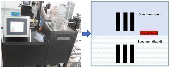 There were two types of samples, no-stress state and applied stress state. Specifically, the size of specimens was 40 mm × 10 mm × 3 mm, with a Φ 6 mm hole on one end. The stressed samples were 115 mm × 15 mm × 3 mm in size, in which the stress, equal to 85% of the nominal yield strength (YSmin) of the material, was applied using the four-point bending method, and stress loading was carried out according to the loading mode and stress calculation method of method E in standard GB/T 4157-2017. Before the test, all the samples were carried out in accordance with the treatment procedures specified in the standard GB/T 15970.2-2000 (ISO 7539-2) so as to avoid and reduce the existence of residual stress. After polishing, the samples were cleaned with distilled water and ethanol, dried under cool air, and stored in a dry N2 atmosphere []. The high-salinity formation water extracted from the oilfield site was adopted as the test solution, and the ion concentration of the water sample was analyzed, as shown in Table 1. Before the test, nitrogen was fed into the solution for deoxygenation treatment, and nitrogen was continuously connected to the autoclave after the sample was installed to remove the oxygen. Then, the solution was heated to the required temperature, and the CO2 and H2S gases were added to the required partial pressure values. The test parameters are shown in Table 2, where H2S partial pressure (PH2S) is divided into two types, PH2S = 0.35 MPa and PH2S = 0.28 MPa, which were to simulate the oil field’s environment with different H2S and CO2 partial pressure ratios. Based on the actual situation of the oil field, the produced fluid comprises three phases of oil, gas, and water. As the produced fluid flows through the tubing, it may come into contact with either the gas phase or formation water (no consideration was given to the contact with crude oil to slow down corrosion here). Therefore, it is necessary to consider installing the sample in a gas and liquid phase environment for evaluation during the simulation testing and to control the amount of solution added according to the volume of the autoclave during the test. The schematic diagram of sample installation is shown in Figure 1.