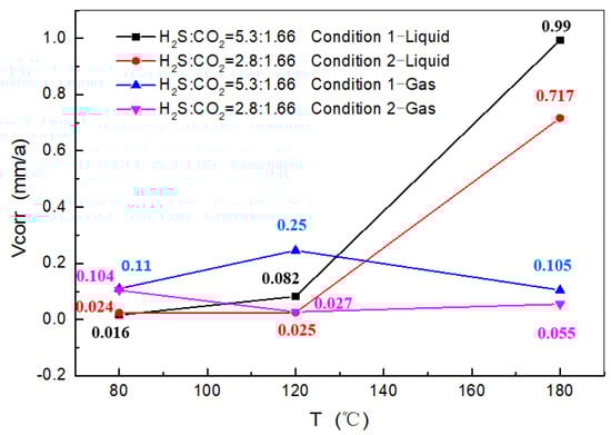By comparison, it can be learned that there is no significant change in the corrosion of materials in a gas phase environment with the temperature. This relates to the extent of random adsorption and condensation of moisture on a material’s surface in a gas phase environment. When the temperature is ≤120 °C, the materials in a gas phase environment are more susceptible to corrosion than those in a liquid phase environment. However, the corrosion of materials in a liquid phase environment is significantly higher than that in a gas phase environment at a temperature of 180 °C, indicating that the effect of a high temperature increases the surface activity of the material and accelerates the electron transfer between the material and the solution medium, thereby rapidly strengthening the electrochemical interaction of the material with CO2 and H2S dissolved in water, further speeding up the corrosion [,,].
