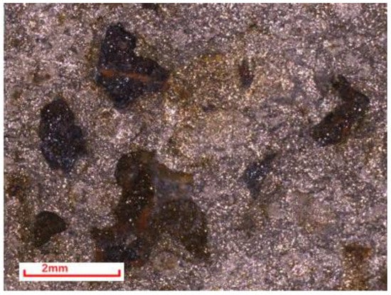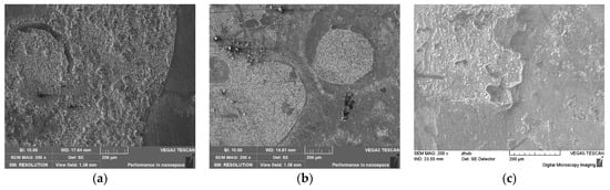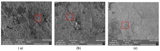 After 720 h of testing, no cracking or fractures were found in the samples. Figure 12 shows the surface corrosion morphology of the samples at different temperatures, with obvious grey corrosion products on the surface of the samples under low temperature conditions (80 °C). However, no obvious local corrosion or cracking was found in the stress concentration area of the samples. Under the high temperature condition of 120 °C, the stress concentration area on the surface of the sample remains flat, but visible uniform micro-pitted morphology can be observed. This indicates that the synergistic effect of the corrosive media and stress causes the pitting nucleation on the material’s surface as the temperature increases. When the temperature rises to 180 °C, the product scale in the surface stress concentration area is rough, loose, and partially detached. Additionally, it is observed by a 30× stereo microscope in the red box area of Figure 12c that the morphology of corrosion pits is present in the local detachment area (Figure 13). As observed by the stereo microscope, the depth of the pits is immeasurable, indicating the relatively shallow depth of the pits. This shows that the pitting nucleation appears on the material’s surface with the increasing temperature under the condition of high-salinity formation water containing H2S/CO2 corrosive gas. In addition, the corrosion pits are relatively obvious at the high temperature of 180 °C, but the pitting does not expand to cause SCC in the specimens.