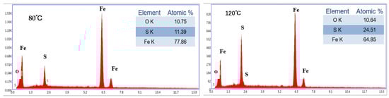 By comparing the element contents of the surface corrosion products under the liquid immersion environment, it can be seen that the content of S shows an increasing trend with the gradual increase in the temperature, indicating that the high-temperature environment promotes the intensification of H2S and substrate corrosion, and that the FeS content in the corrosion film increases, leading to more severe corrosion [,].