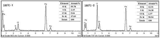 EDS was used to analyze the corrosion product films on the surfaces of the materials under liquid phase conditions at different temperatures (Figure 11), and it was found that they were mainly composed of O, S, and Fe elements. At the same time, with the increase in the simulated test temperature, the product films were relatively thicker at 180 °C, and a second product film was visible at the shed area, indicating that the bare substrate continued to be corroded, and the content of S in the product films gradually increased. These results indicate that in the co-existence environment of CO2/H2S, corrosive gases cooperate with the high temperature to accelerate the electrochemical action of the solution system and promote the intensification of corrosion. Although the increasing temperature decreases the solubility of corrosion gas, the activity of the solution system increases with the increasing temperature, accelerating electron transfer. The Cl− ion in the product film is the residue of the solution medium.
