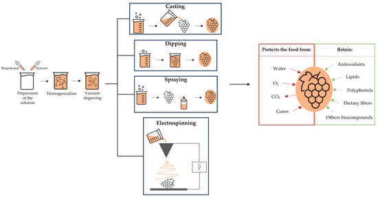 For the manufacturing of films and coatings, different techniques will be presented in this review (Figure 1), as we will also talk about the different matrices that can be used in the realization of edible coatings.