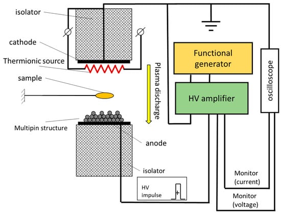The experimental setup of cold atmospheric plasma assisted by thermionic emission is shown in Figure 2. Positive high-voltage pulses were generated by a system consisting of an Agilent 33220A function generator (Agilent Technologies, Santa Clara, CA, USA) and a high-voltage amplifier: a Matsusada 20-B-20 (Matsusada Precision Inc, Otsu, Japan). The amplifier maximum output voltage was 20 kV. Atmospheric microplasma generation was carried out with the support of a thermionic emission source in the form of a filament (active resistance value Ra = 2 ohms, V = 1.0 V). Amplitude, pulse duration and shape characteristics of the current and discharge voltage were monitored by a digital oscilloscope (Tektronix TDS 220) via the monitor output for current and voltage on a high-voltage amplifier. The pulse duration of the supplied pulse to the high-voltage amplifier was set at 100 microseconds. The characteristics of the supplied pulses were selected based on the conditions of gentle wheat seed microplasma treatment, which occurs at high values of current density.