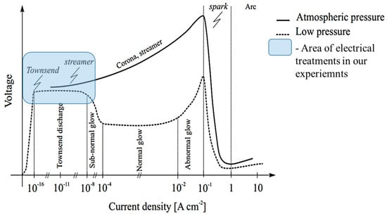 Authors will not analyze the curve in detail but the area selected and highlighted in blue color corresponds to the atmospheric discharges for the experiments. This kind of plasma assisted by thermionic emission is more relevant for grains, when it comes to large capacities of industrial processing. Such CAPs are characterized by very low current densities. The discharge is sustained by the emission of electrons via ion bombardment of the cathode. Thermionic emission sources can be found in SEM technologies, spectral technique and other fields of coating technologies [,].
