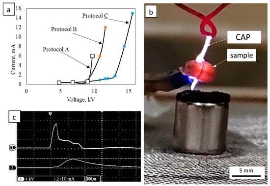 Electrons flow starting from the cathode was accelerated by an applied external electric field. Figure 4a presents the experimental results of volt–ampere characteristics for electrode configurations with experimental protocol indication (□) and comparison with CAP mode without TE (∆). The resulting I–V characteristic demonstrates a microplasma discharge mode at low current values. It was obtained that the current values for protocols A, B, and C were 2 mA, 10 mA and 15 mA, respectively.