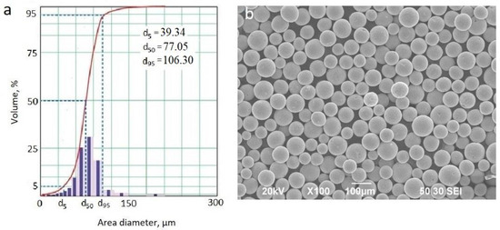 (a) Integral curve and particle size distribution histogram of PMS-M99.9 powder; (b) surface morphology of powder particles [18].