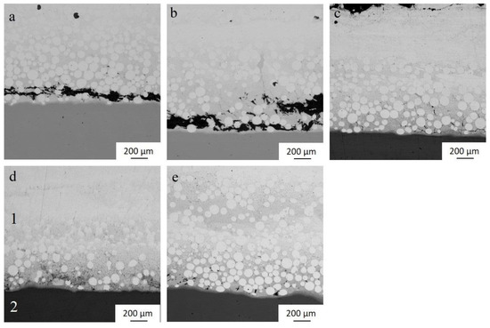SEM images of the cross section microstructure of the deposited Mo coatings on the 25L steel (×200). Images (a–e) correspond to the samples and working parameters in Table 5. Designations: 1–4 mm thick deposited LDED coating; 2–10 mm thick 25L steel substrate.