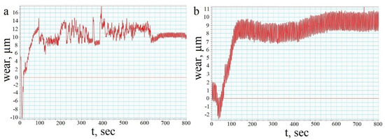 From the graphs presented in Figure 9, it can be seen that for the deposited specimens wear after the running-in period is lower than that for the brazed molybdenum plate. The running-in period is also much shorter.