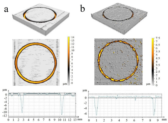 The three-dimensional topographies and a top view of wear paths: (a) Mo plate brazed to steel; (b) LDED deposited Mo layer on 25L steel. Technological parameters set d, according to the Table 5. Wear depth is shown on the color scale, V = 200 rpm, F = 10 N, S = 94 m.