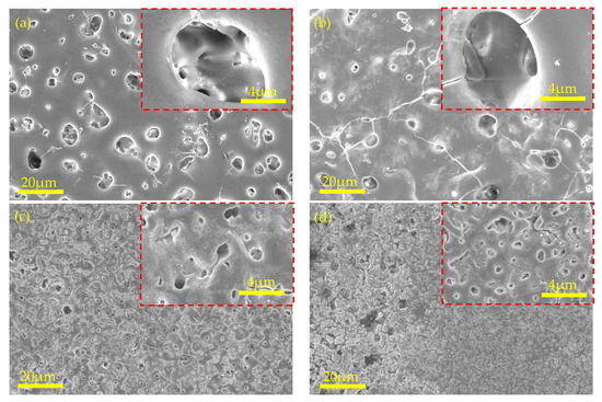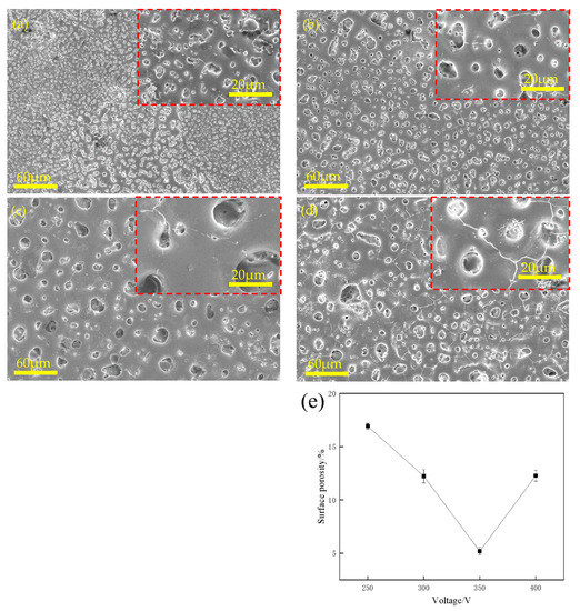The surface micromorphologies of the MAO coatings produced using 5 g/L KOH at various voltages are shown in Figure 6. Numerous micropores began to form on the MAO surface when the voltage reached 250 V (Figure 7a), and flat areas began to form because of the dense, tiny spark discharge. The MAO coating exhibited a crater-like morphology as the voltage increased because the spark discharge intensified. Many microcracks emerged on the surface of the MAO coating when the voltage exceeded 400 V (Figure 7d).