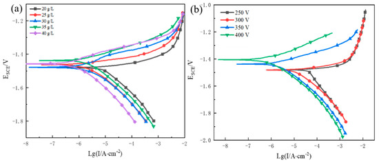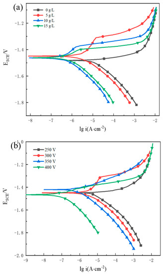 Polarization curves of MAO−treated AZ31B alloy in 3.5 wt% NaCl solution: (a) various Na3PO4 concentrations at 350 V and (b) various voltages with 35 g/L Na3PO4 concentration.