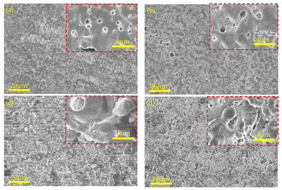 Figure 5 shows the surface micromorphology of the MAO coatings obtained at various concentrations of KOH. The number of micropores on the surface of the MAO coating increased with increasing KOH concentration and the micropore size decreased. More interconnected microcracks appeared on the surface of the MAO coating when the KOH concentration was 5 g/L than when it was 0 g/L. New structures in the MAO coating emerged at KOH concentrations of 10 and 15 g/L (Figure 6c,d), where the “crater” morphology of the MAO coating was prominent. This led to the conclusion that powerful sparks were responsible for the formation of a protruding structure. The violent breakdown discharge of the coating triggered localised breakdown and melting of the film layer, which resulted in the creation of violent sparks. The old structure was destroyed and replaced with a new one whenever the KOH concentration reached a specified level. The new structure of the MAO surface was denser, the number of micropores increased, and the size of the micropores decreased.