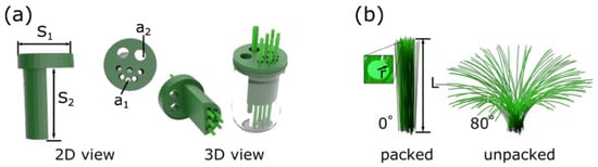 Design of electrochemical setup used for CFMB electrodes. (a) The size of the 3D-printed cap (S1 = 26 mm, S2 = 44 mm, a1 = 3 mm, a2 = 6 mm) and electrochemical cell (3D view) after loading CFMB electrodes (pseudo-coloured in green) for studies of [Fe(CN)6]3−/4− and DA. (b) Simulated view of CFMB area accessible for sensing with a length of the electrode L = 2 × 10−2 m and radius r = 3.5 × 10−6 m; CFMB electrode is shown in packed and unpacked mode.