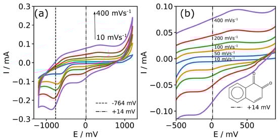 (a) CVs of the CFMB electrode in 0.1 M of PB (pH 7.4) from −1200 mV to 1200 mV vs. Ag/AgCl at different scan rates (10, 50, 100, 200, 400 mVs−1), OCP (14 mV). (b) An enlarged area of the CVs showing surface confined redox species on the CFMB electrode; the inset shows the structure of 1,2-naphthoquinone.