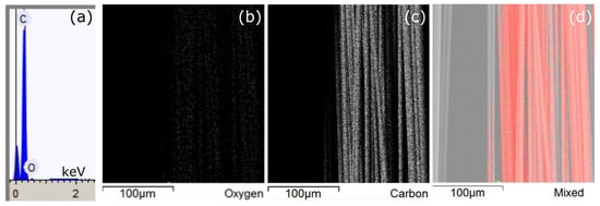 The oxygen possibly related to the above-mentioned functionalities was present in the EDX measurements represented in Figure 4, where the EDX spectra were measured at a 15 mV accelerating voltage, showing 96.5% of C and 3.5% of O present at the CFMB electrode. Representative EDX mapping images showed minor amounts of oxygen present (Figure 4b,d) with dominating amounts of carbon (Figure 4c,d) in the CFMB electrode.