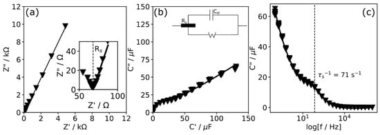 (a) Nyquist plot in 0.1 M PB from 100,000 Hz to 0.1 Hz, the amplitude of 10 mV at OCP (at 14 mV); the inset shows a ‘zoomed-in’ area of the plot at high frequencies highlighting the position of Rs in 0.1 M PB appearing from impurities (1,2-naphthoquinone) of the CFMB electrode. (b) Cole–Cole plots showing pseudo redox capacitance of the porous redox-active layer. (c) C″ plots vs. frequency showing the position of the relative time constant, τr−1. Inset shows the equivalent circuit used to obtained values of Rs.